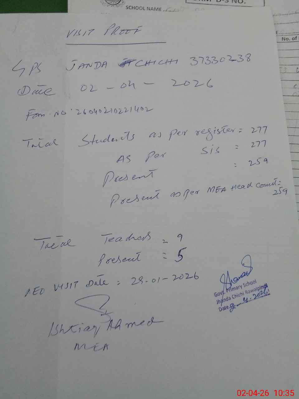 | Attendance Register | Head Teacher | MEA with School | Visit Proof |