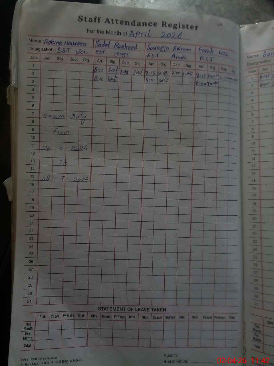 | Leave | Duty | Absent | Maternity | Medical | Ex- Pak |