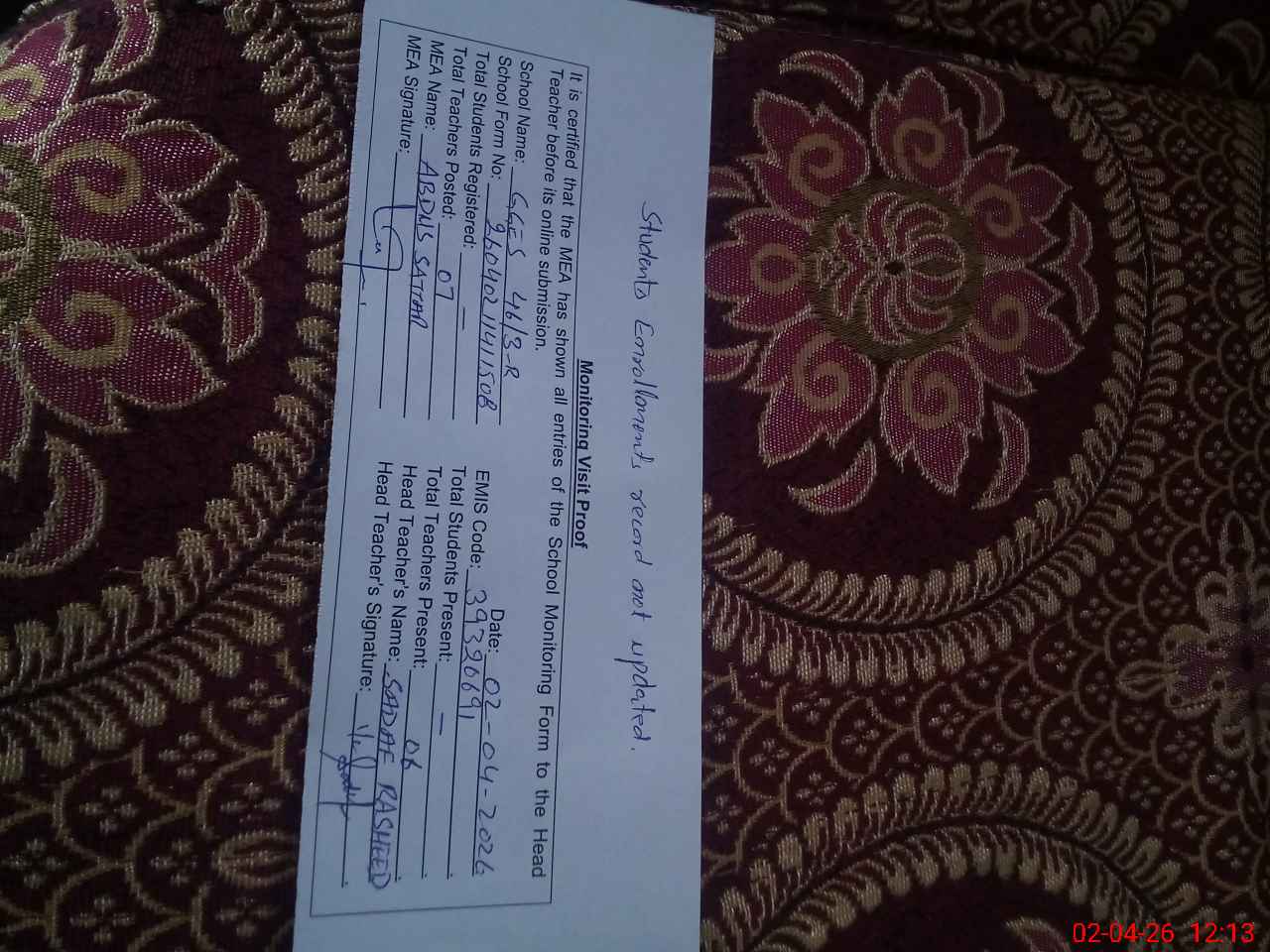 | Attendance Register | Head Teacher | MEA with School | Visit Proof |