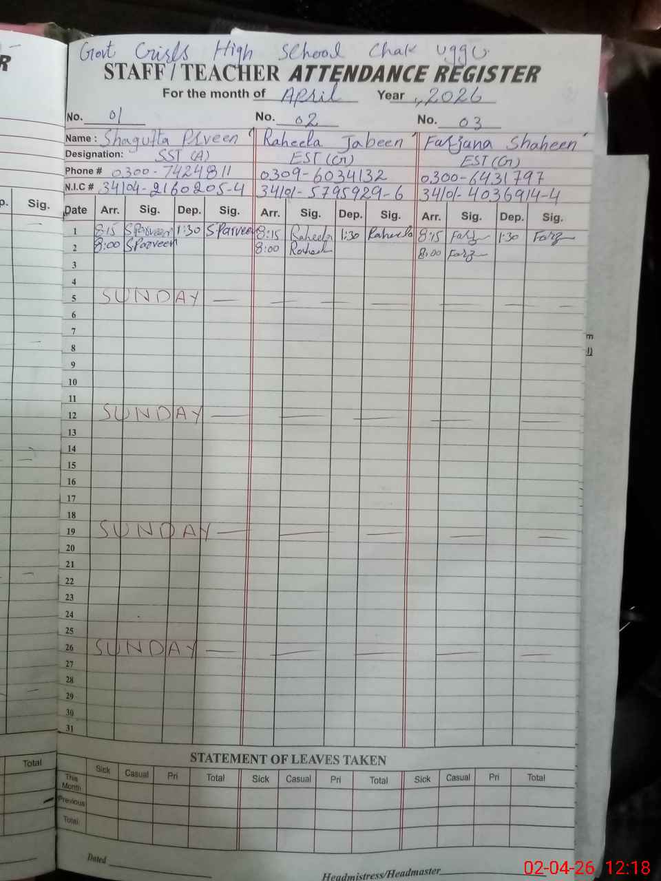 | Name: Sh**** Pe**** Designation: (School Headmaster's/Headmistress's) S S T GEN Phone/Cell Number: 03**** |