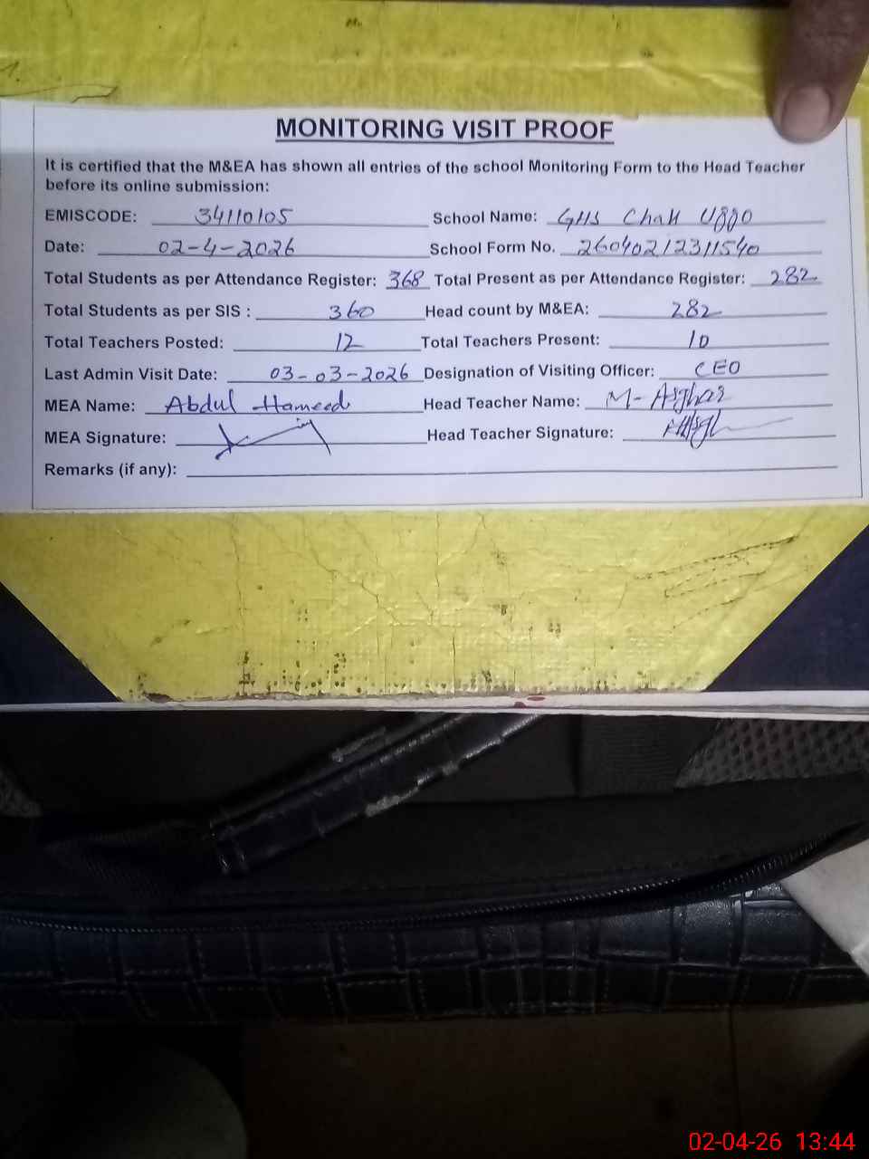 | Attendance Register | Head Teacher | MEA with School | Visit Proof |
