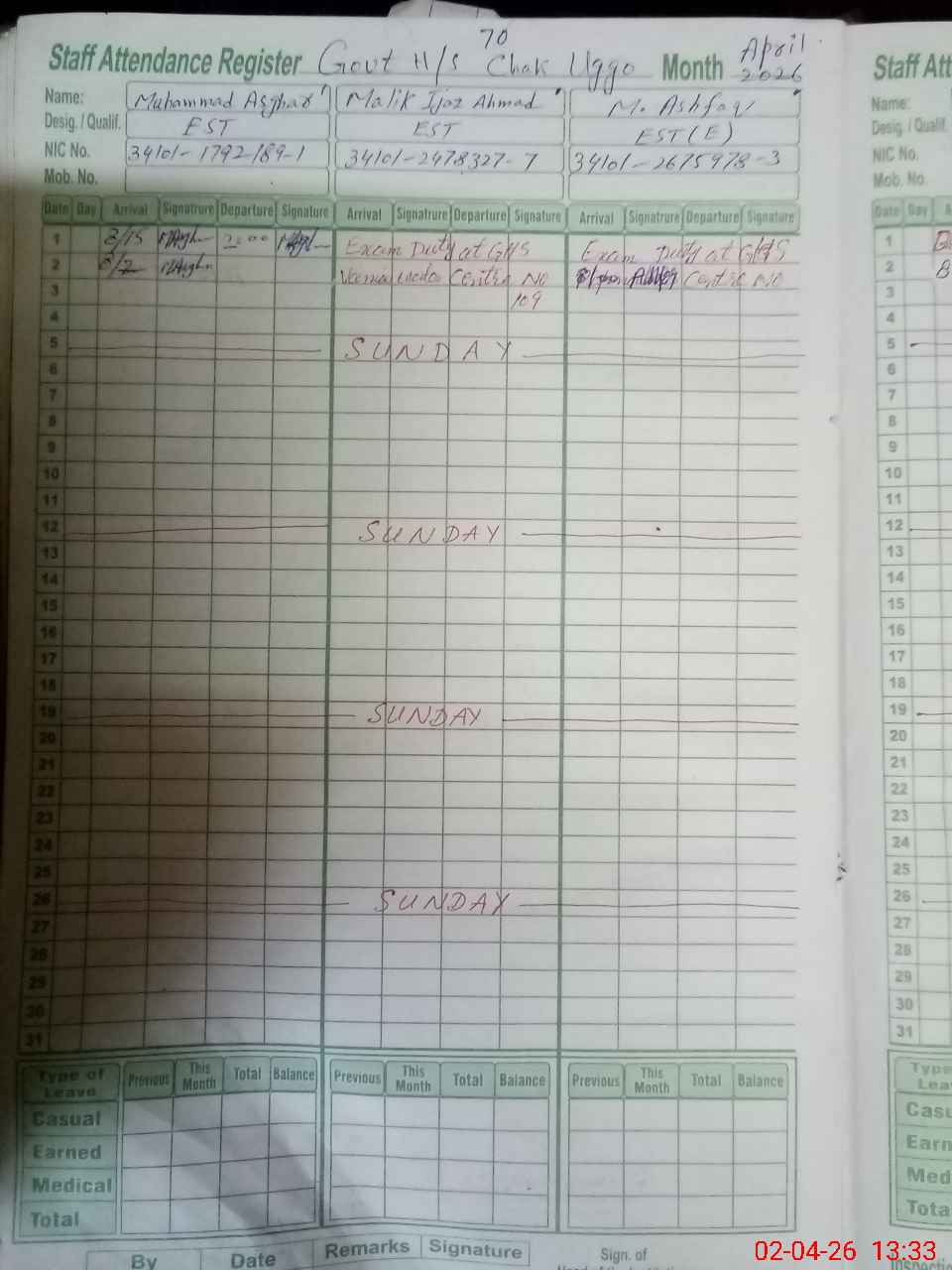 | CNIC | Full Name | Designation | R/C | Absence During Last Calender Month |