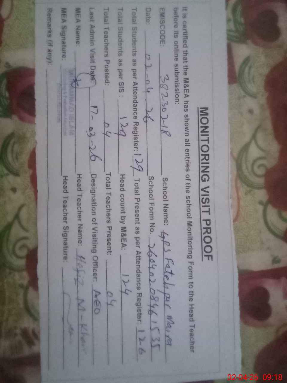 | EMIS Code: 38230218 | Name of School: GPS FATEHPUR MAIRA | |||