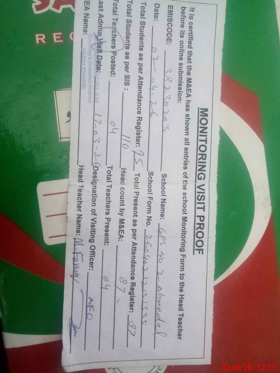 | EMIS Code: 38230203 | Name of School: GPS NO. 2 AHMEDAL | |||