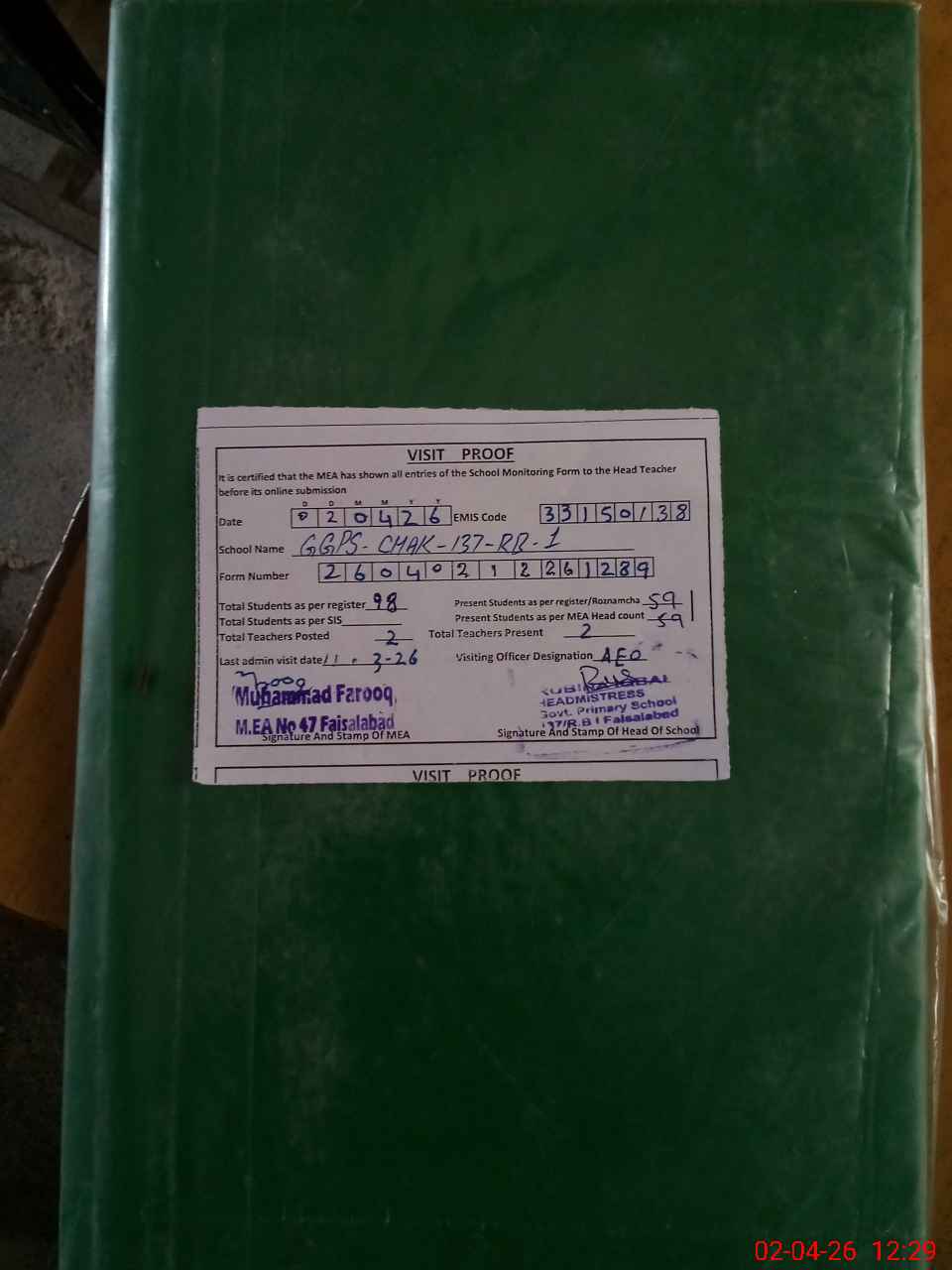 | EMIS Code: 33150138 | Name of School: GGPS CHAK 137 RB 1 | |||