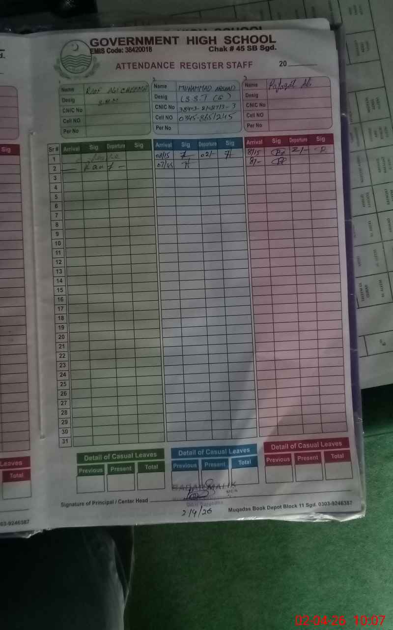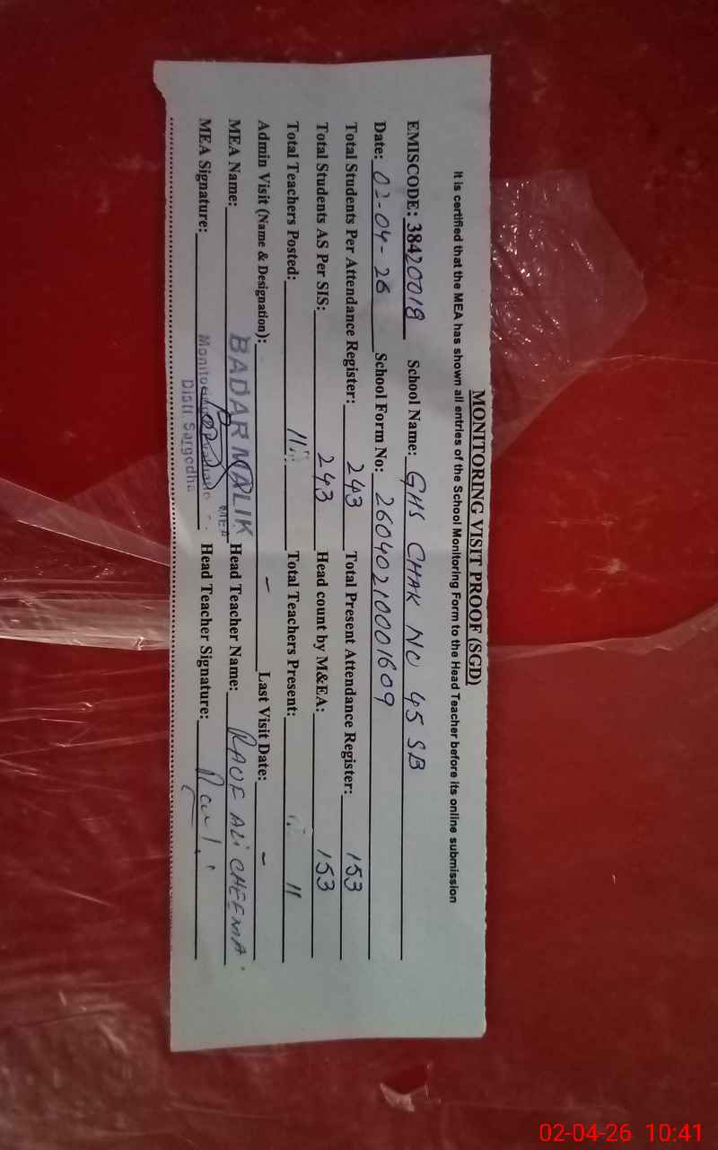 | EMIS Code: 38420018 | Name of School: GHS CHAK NO.45 SB SGD | |||