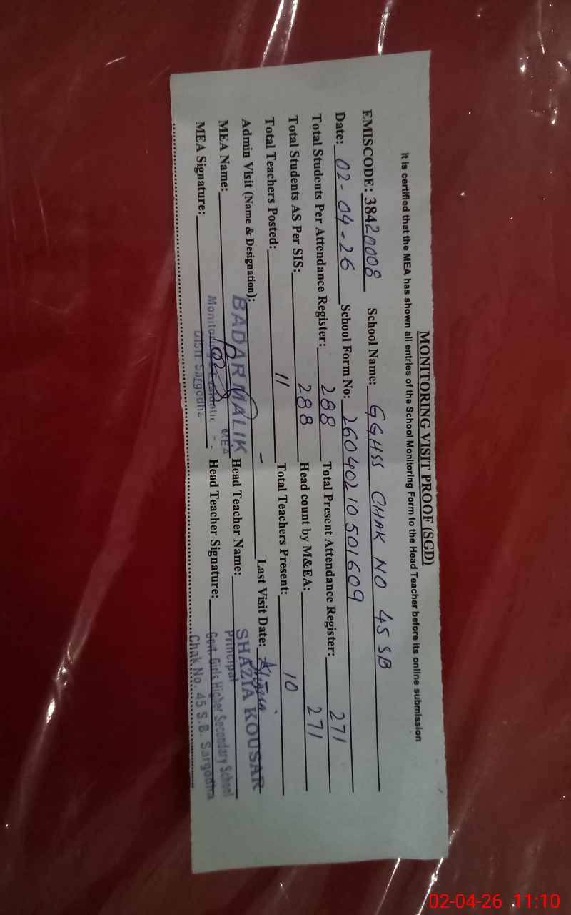 | EMIS Code: 38420008 | Name of School: GGHSS CHAK NO.45 SB | |||