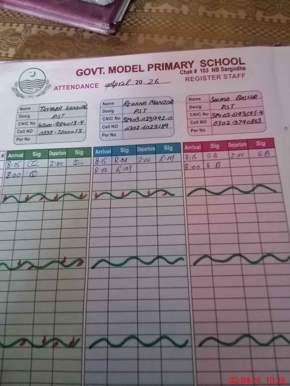 | CNIC | Full Name | Designation | R/C | Absence During Last Calender Month |