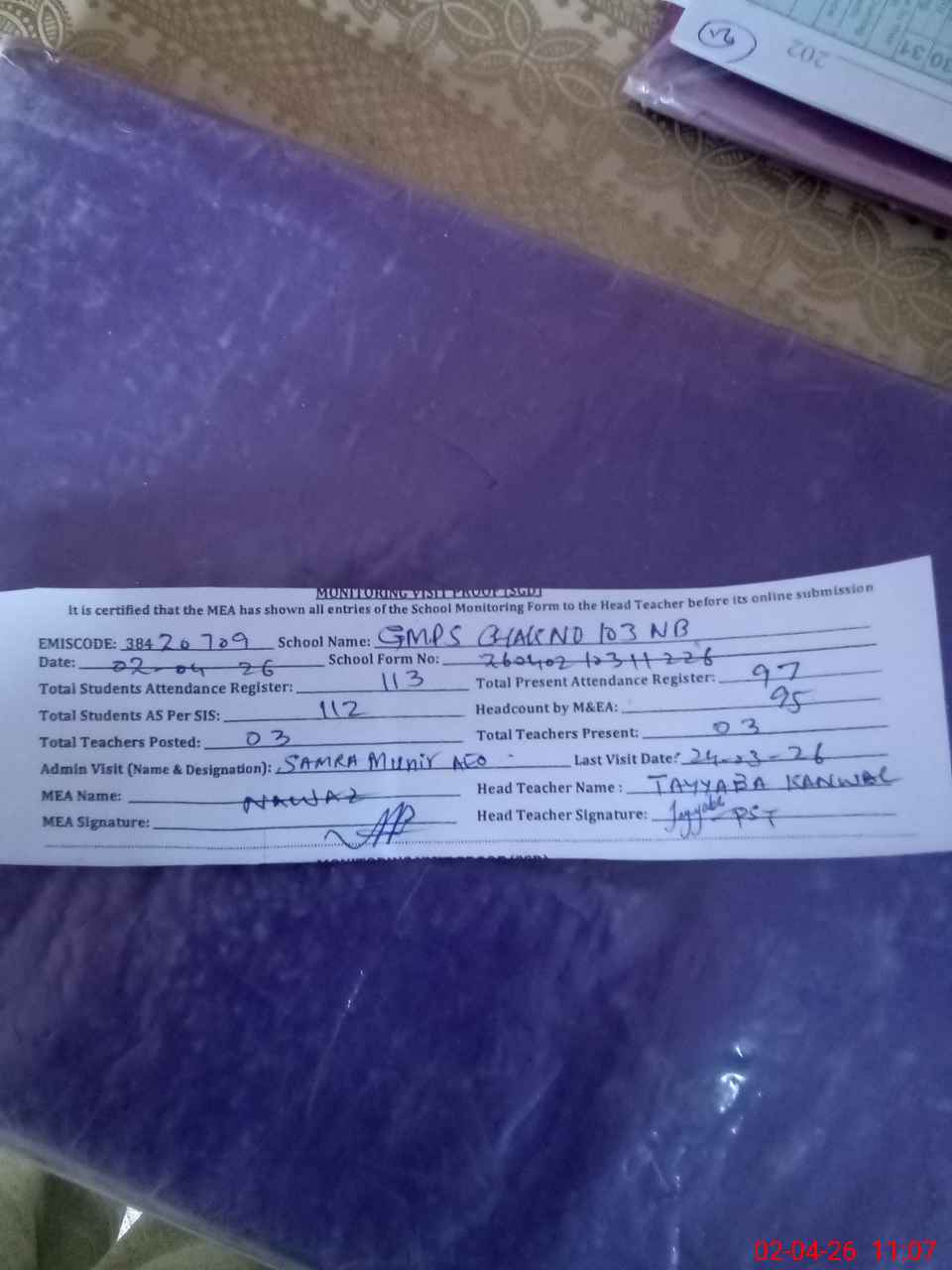 | Attendance Register | Head Teacher | MEA with School | Visit Proof |