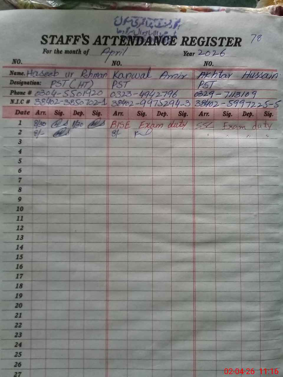 | 38**** | Ak**** Hu**** | PST Arts | Regular | 0 | 0 | 0 | 0 | 0 | 0 | 0 | 0 | 0 | Exam Duty |