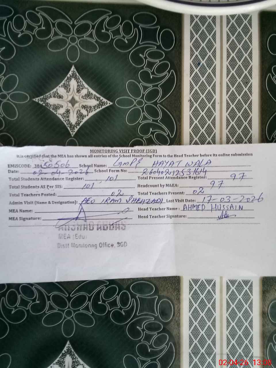 | EMIS Code: 38450506 | Name of School: GMPS HAYAT WALA | |||