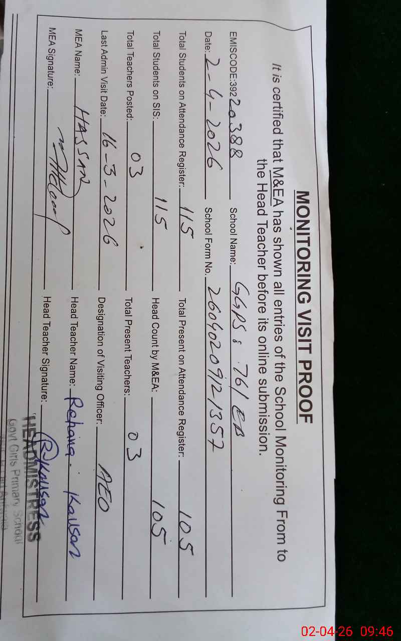 | EMIS Code: 39220388 | Name of School: GGPS 76 EB ARIFWALA | |||