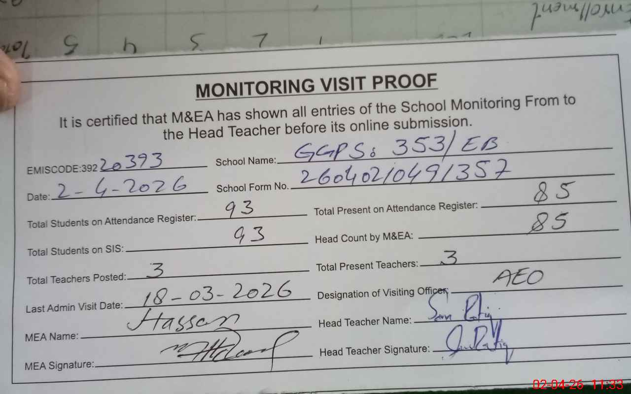 | EMIS Code: 39220393 | Name of School: GGPS 353 EB ARIFWALA | |||