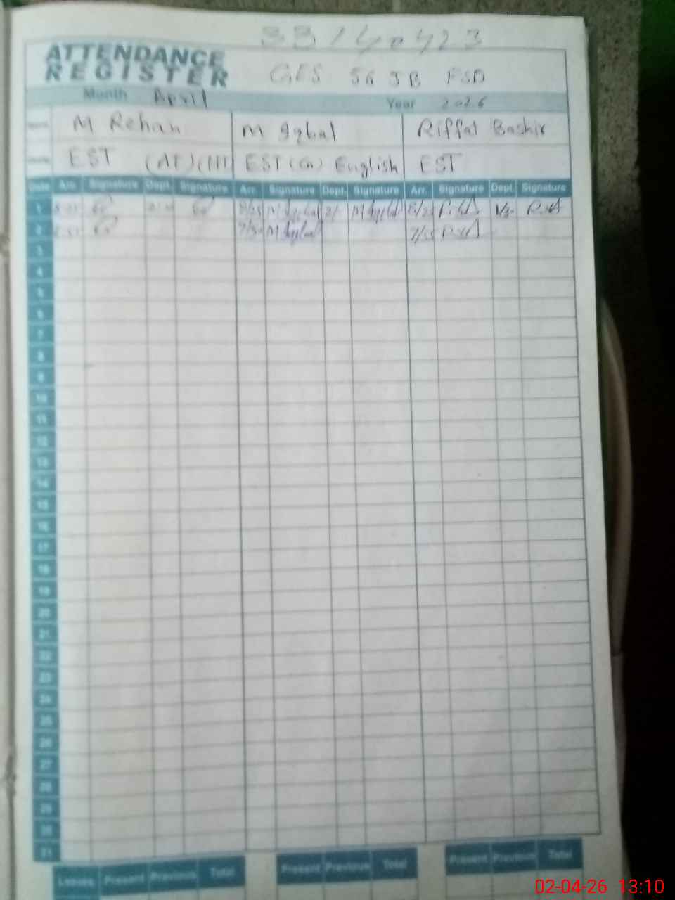 | CNIC | Full Name | Designation | R/C | Absence During Last Calender Month |