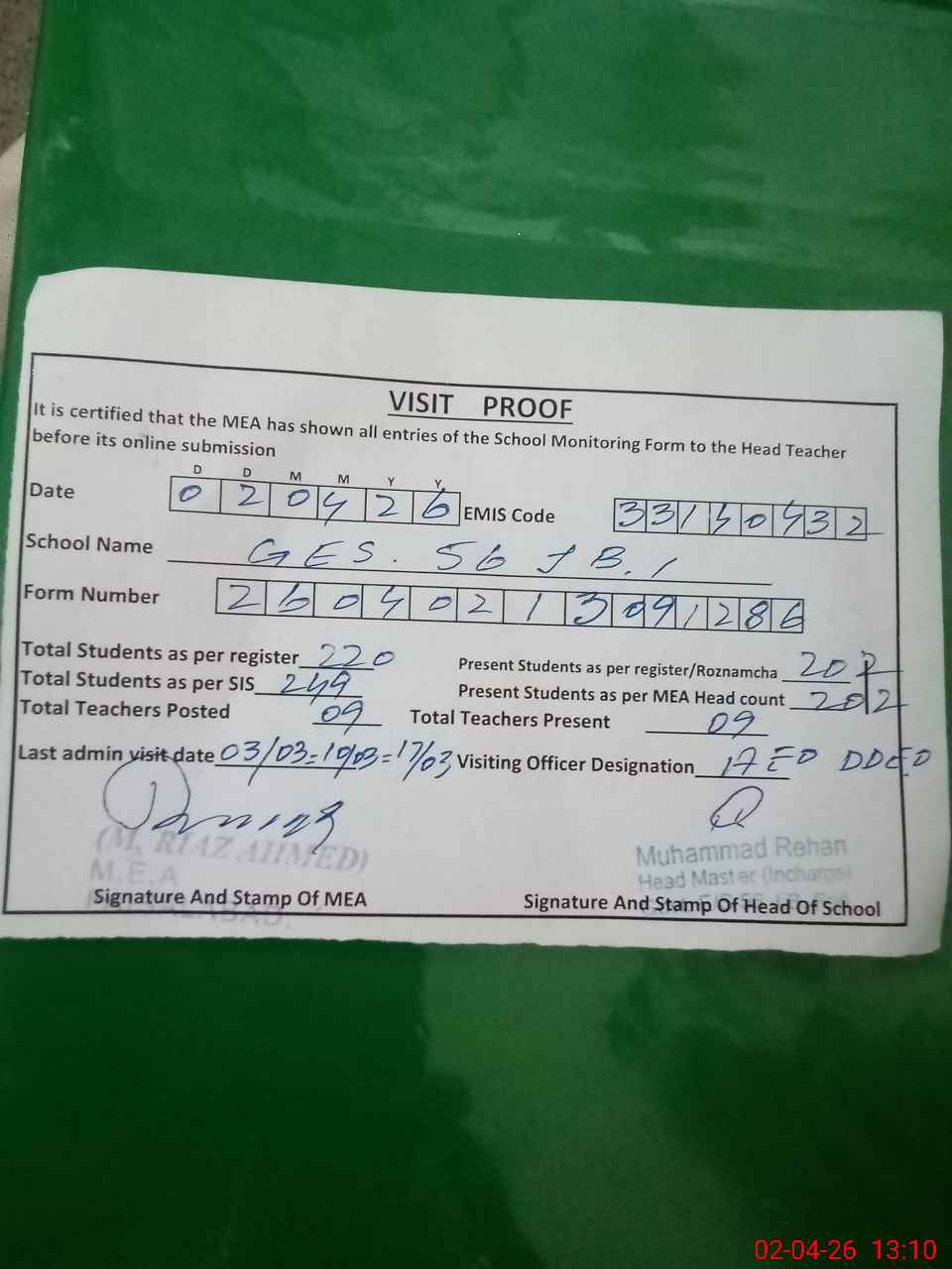 | Attendance Register | Head Teacher | MEA with School | Visit Proof |