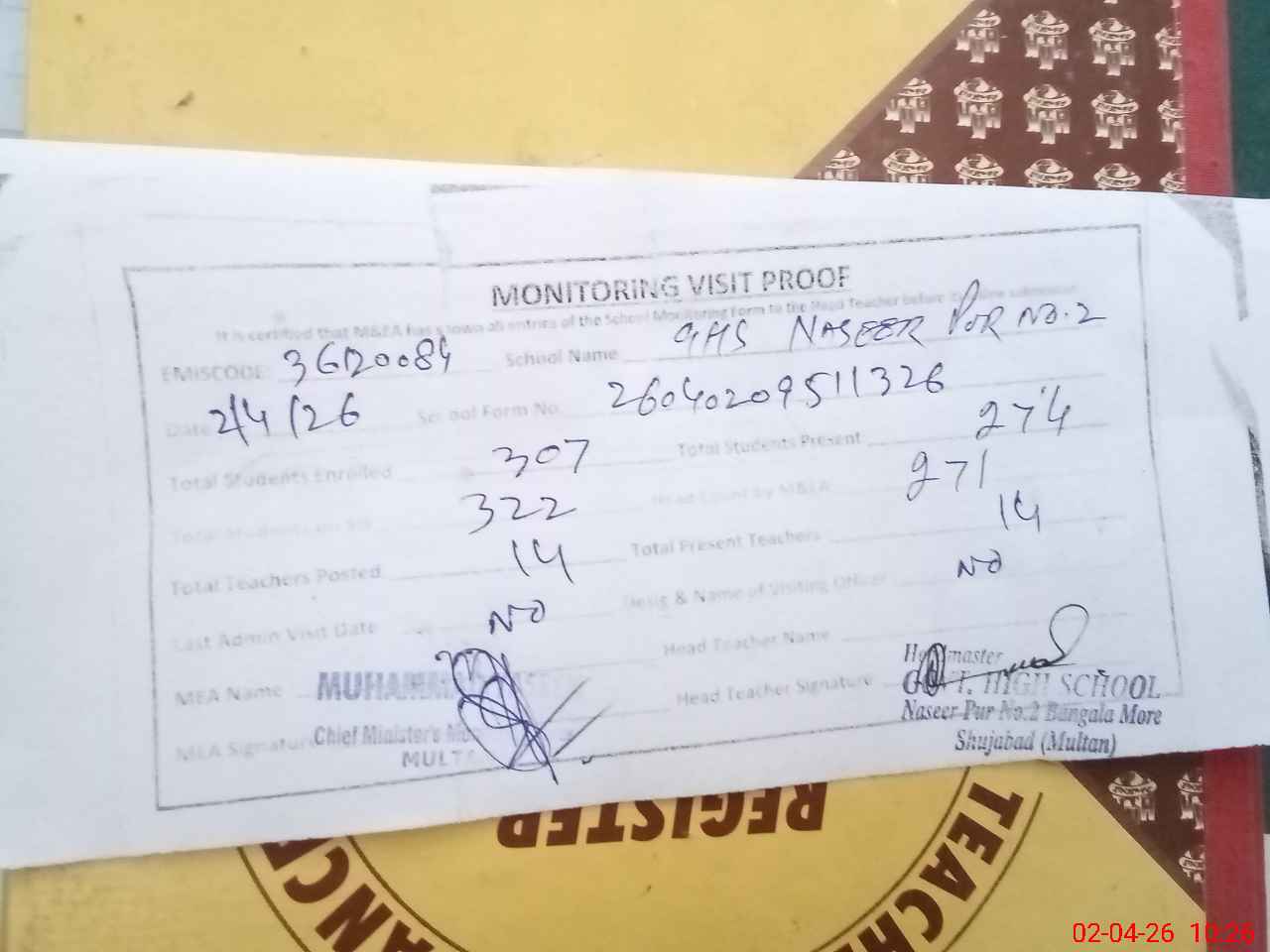 | EMIS Code: 36120084 | Name of School: GHS NASEER PUR NO.2 SHUJABAD | |||