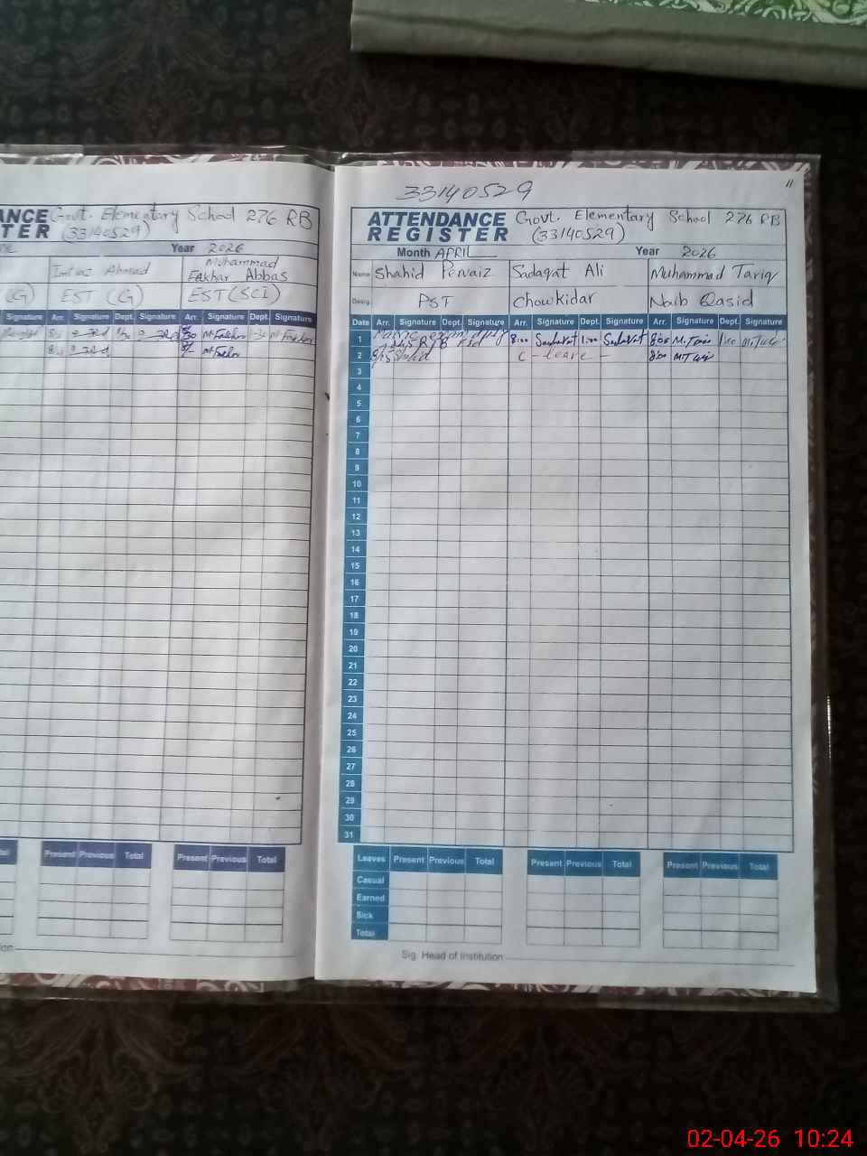 | Remarks (Use Separate Page if Required): Daily attendance register of students not maintained today dt 02 April 2026. | |||||