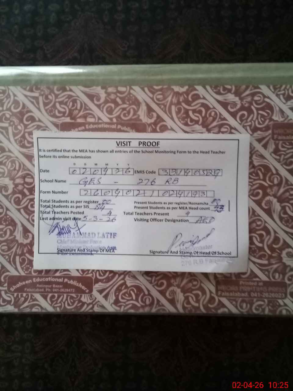 | Attendance Register | Head Teacher | MEA with School | Visit Proof |