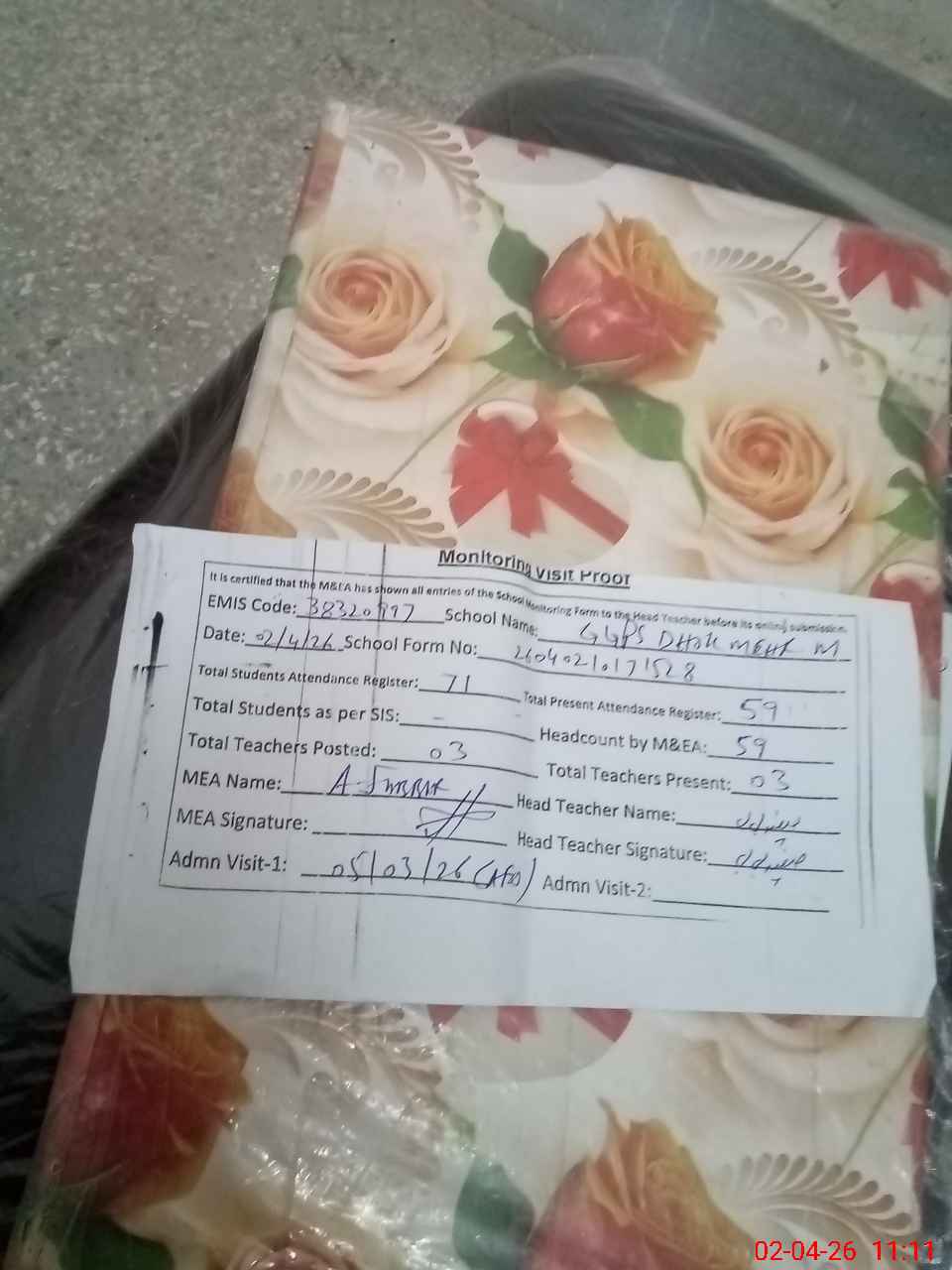 | Attendance Register | Head Teacher | MEA with School | Visit Proof |