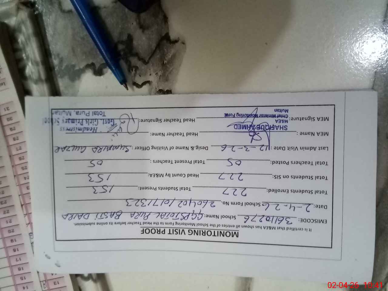 | Certified that this School was Inspected by the Undersigned MEA/DMO Today and the Information Stated Above is as Per Record. | |||||