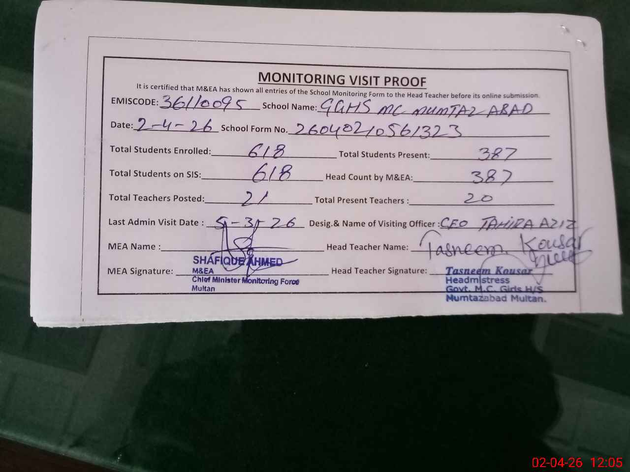 | EMIS Code: 36110095 | Name of School: GGHS MC MUMTAZ ABAD MULTAN | |||
