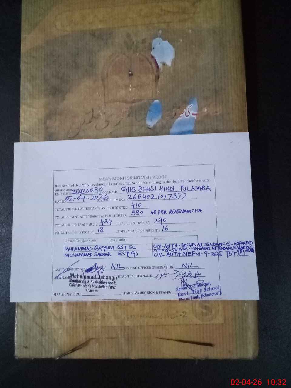 | EMIS Code: 36430030 | Name of School: GHS BHUSI PINDI, TULAMBA | |||