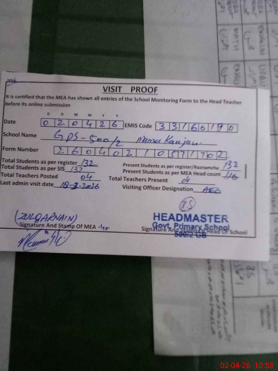 | Attendance Register | Head Teacher | MEA with School | Visit Proof |