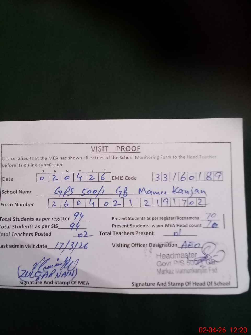 | EMIS Code: 33160189 | Name of School: GPS CHAK 500 GB I MAMUNKANJAN | |||