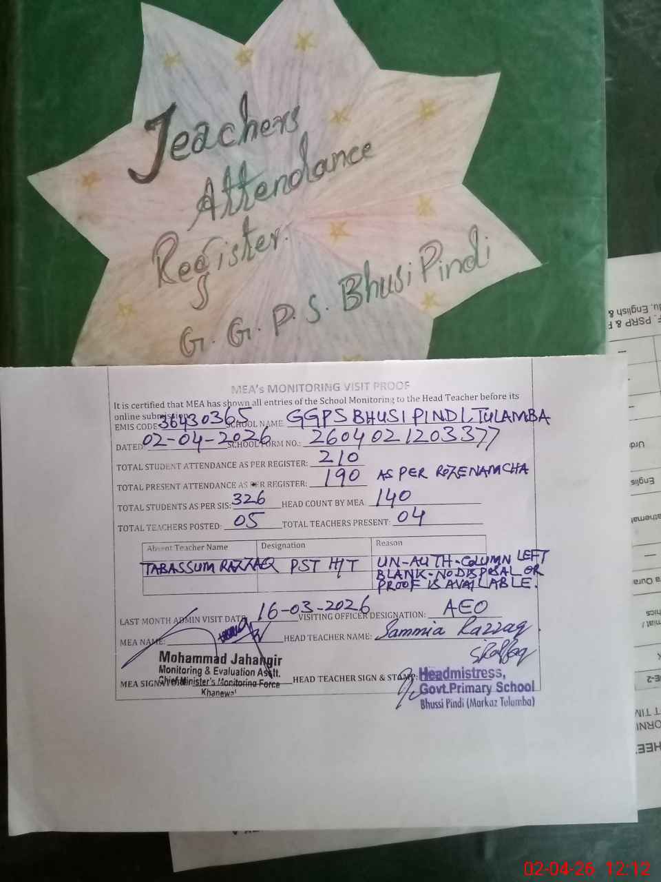 | Attendance Register | Head Teacher | MEA with School | Visit Proof |