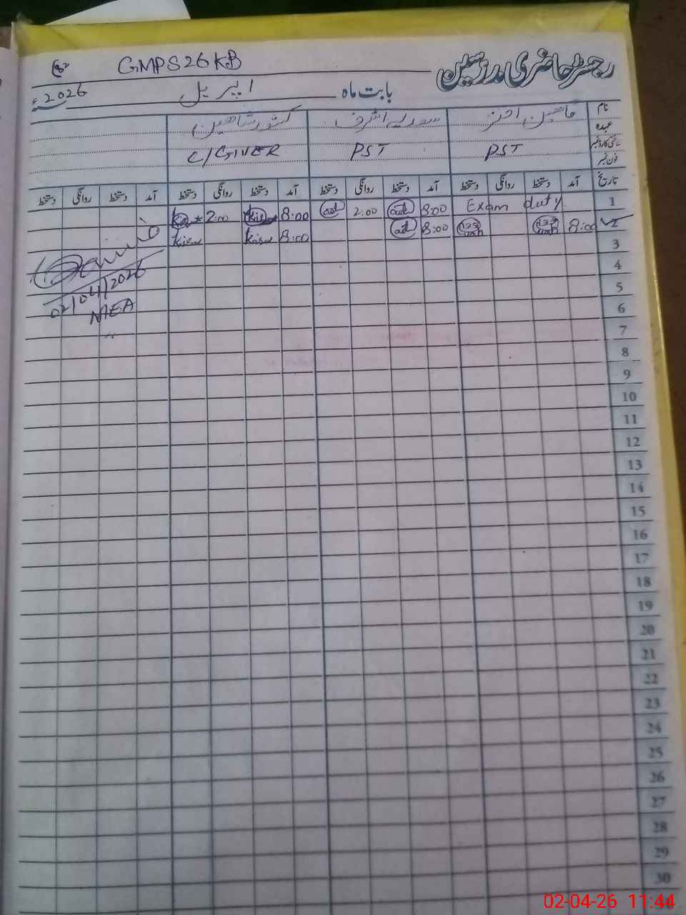 | CNIC | Full Name | Designation | R/C | Absence During Last Calender Month |