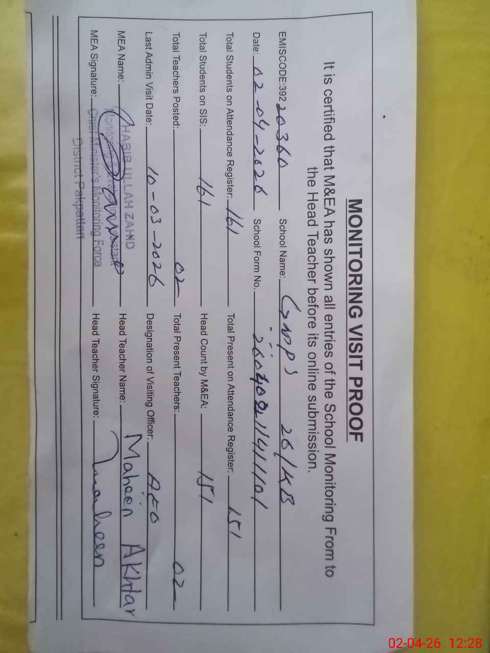 | Attendance Register | Head Teacher | MEA with School | Visit Proof |