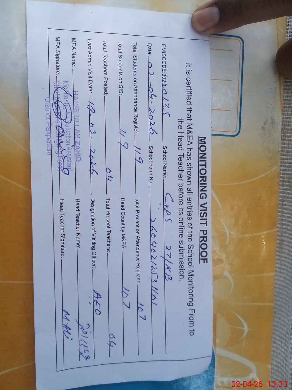 | Attendance Register | Head Teacher | MEA with School | Visit Proof |