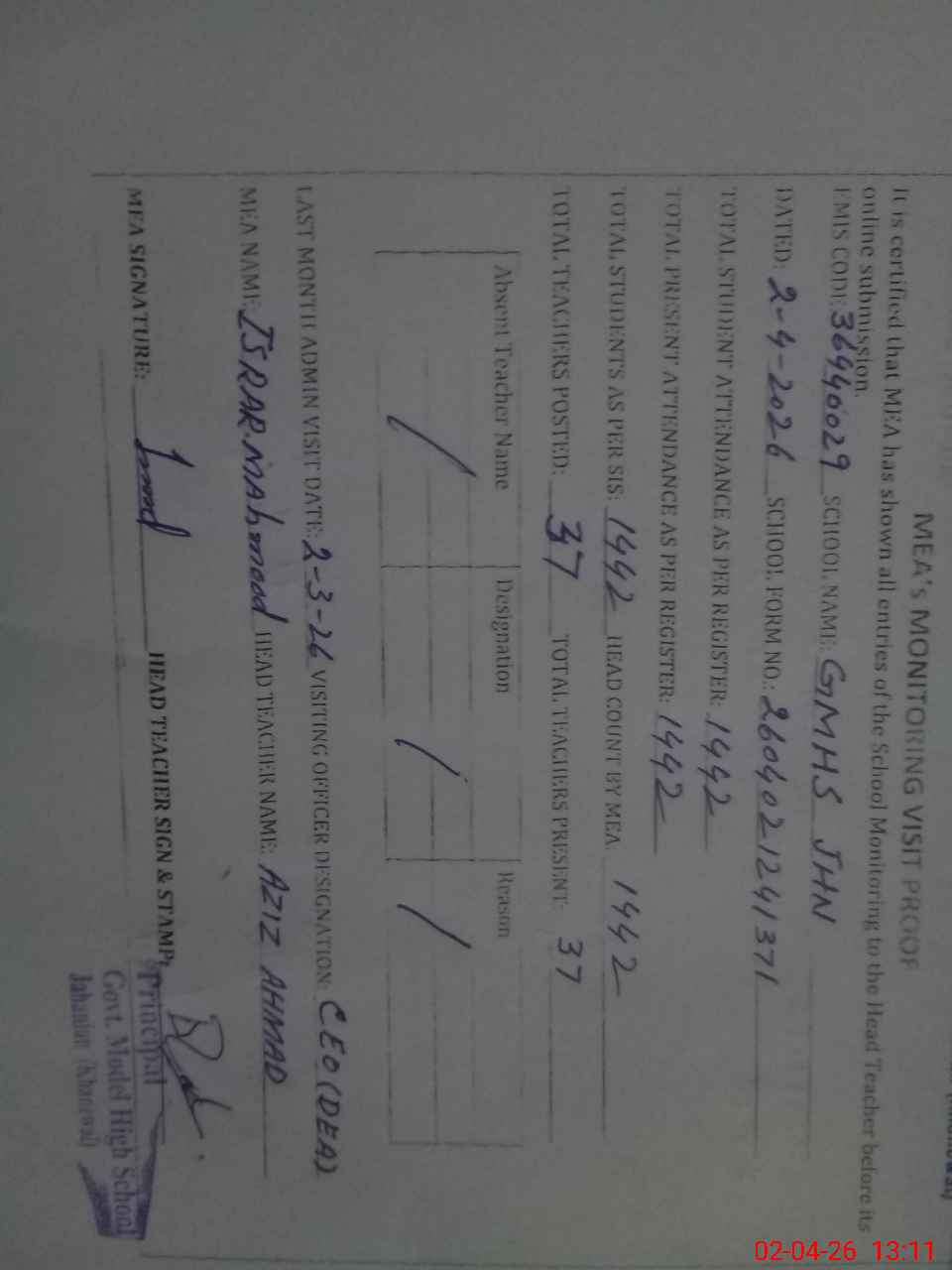 | Attendance Register | Head Teacher | MEA with School | Visit Proof |