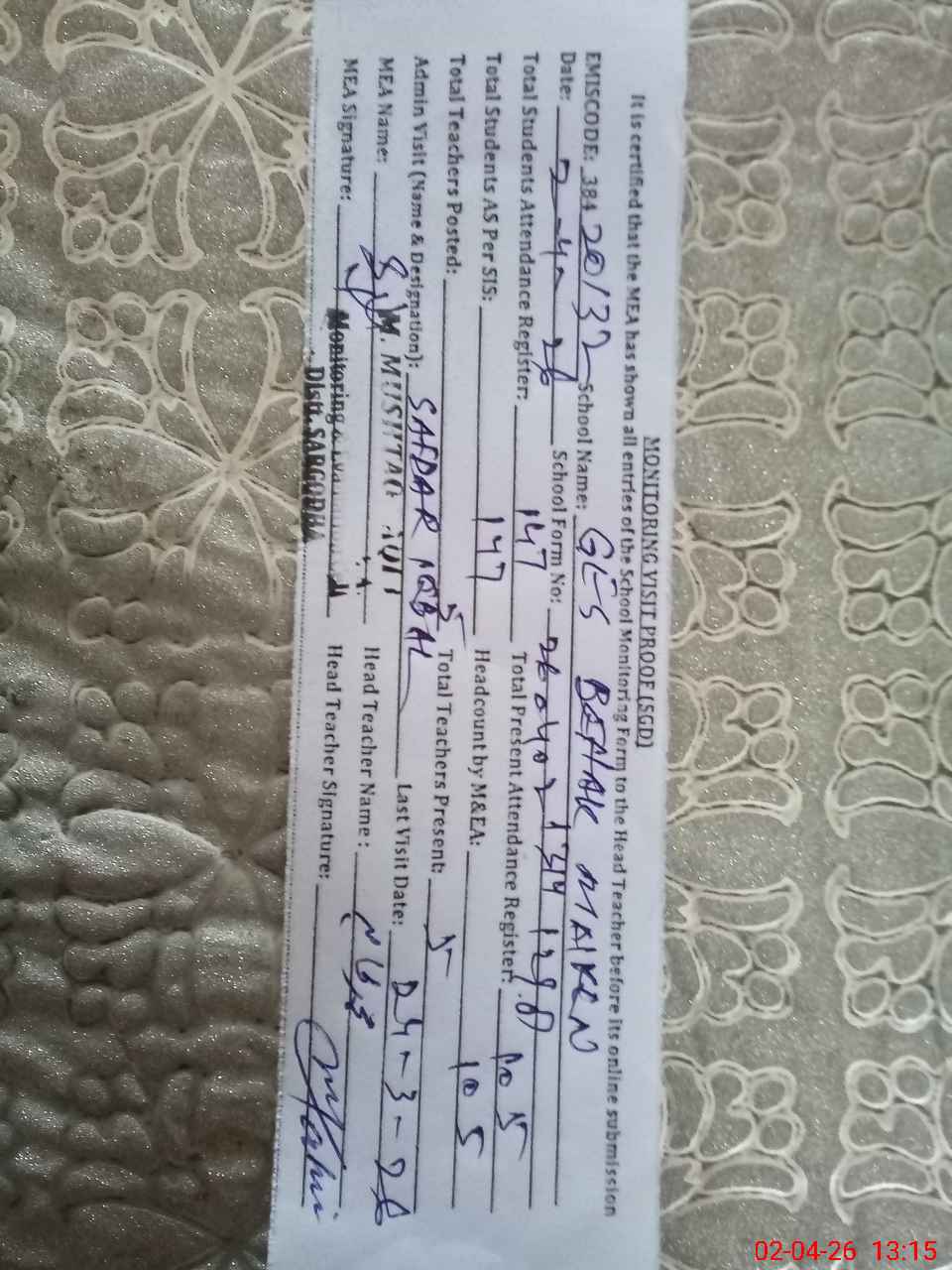 | Attendance Register | Head Teacher | MEA with School | Visit Proof |