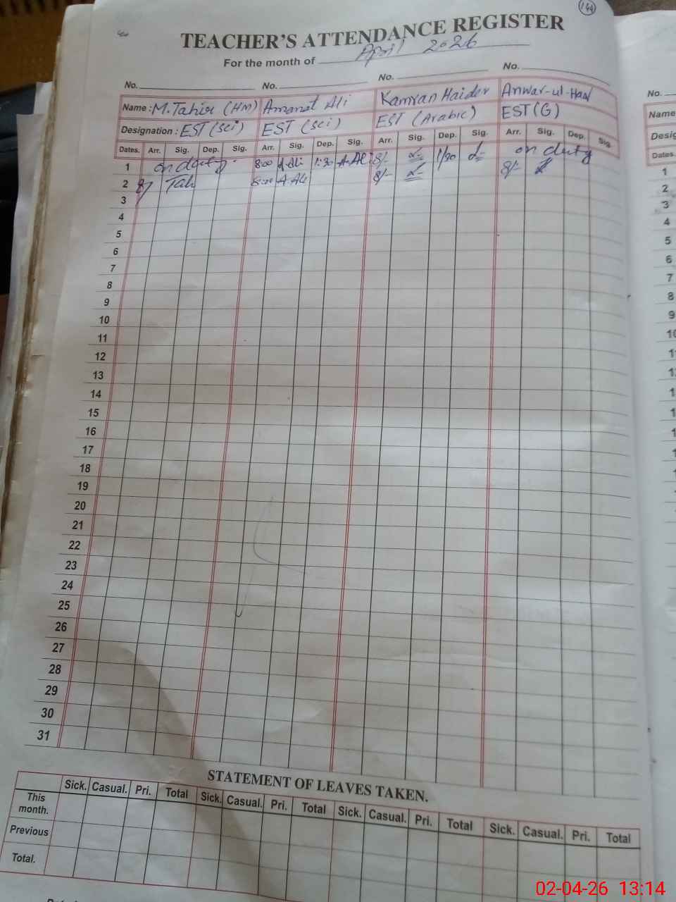 | Leave | Duty | Absent | Maternity | Medical | Ex- Pak |