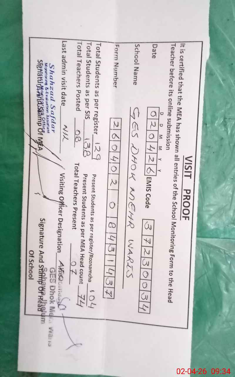 | EMIS Code: 37230034 | Name of School: GES DHOK MEHR WARIS | |||