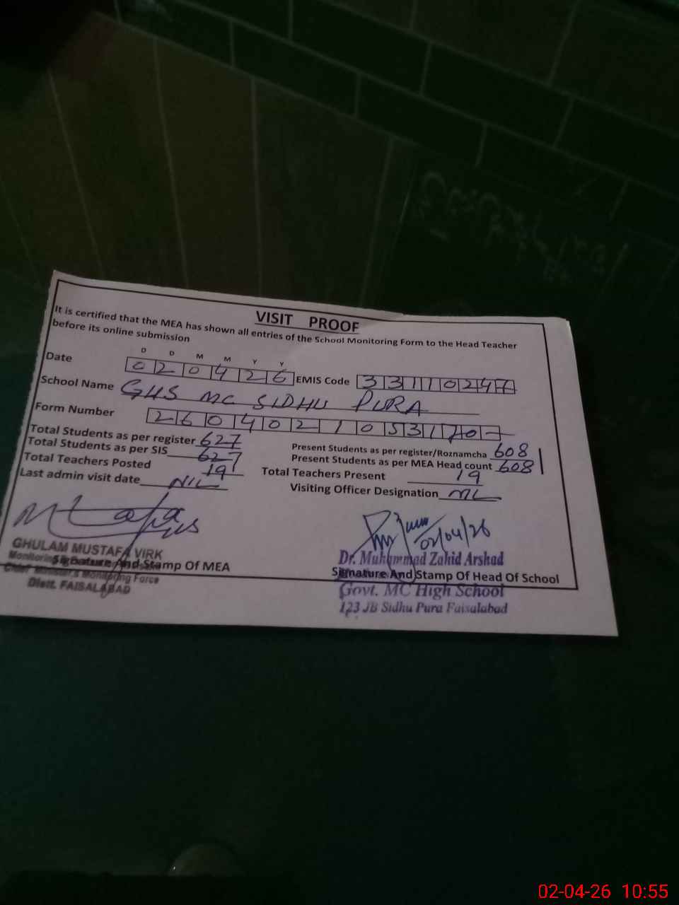 | Attendance Register | Head Teacher | MEA with School | Visit Proof |