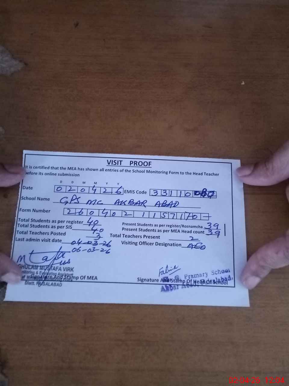 | Attendance Register | Head Teacher | MEA with School | Visit Proof |