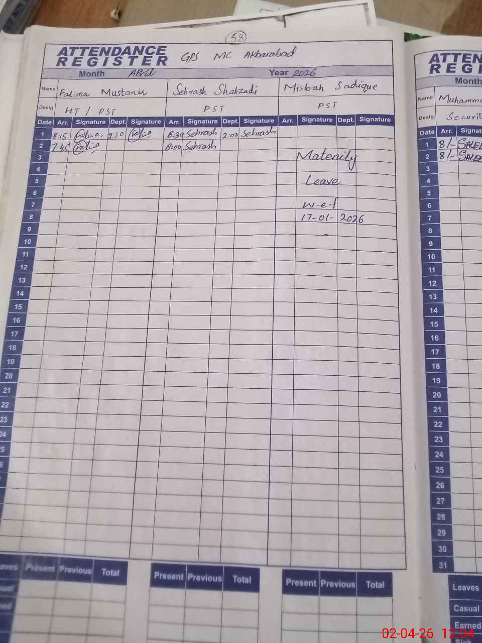 | Leave | Duty | Absent | Maternity | Medical | Ex- Pak |