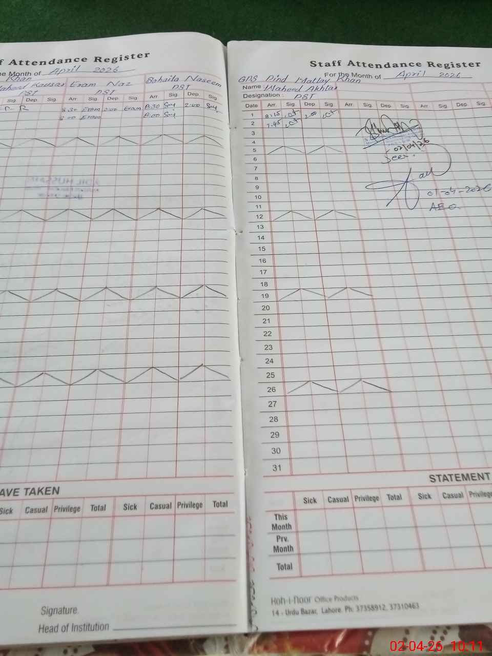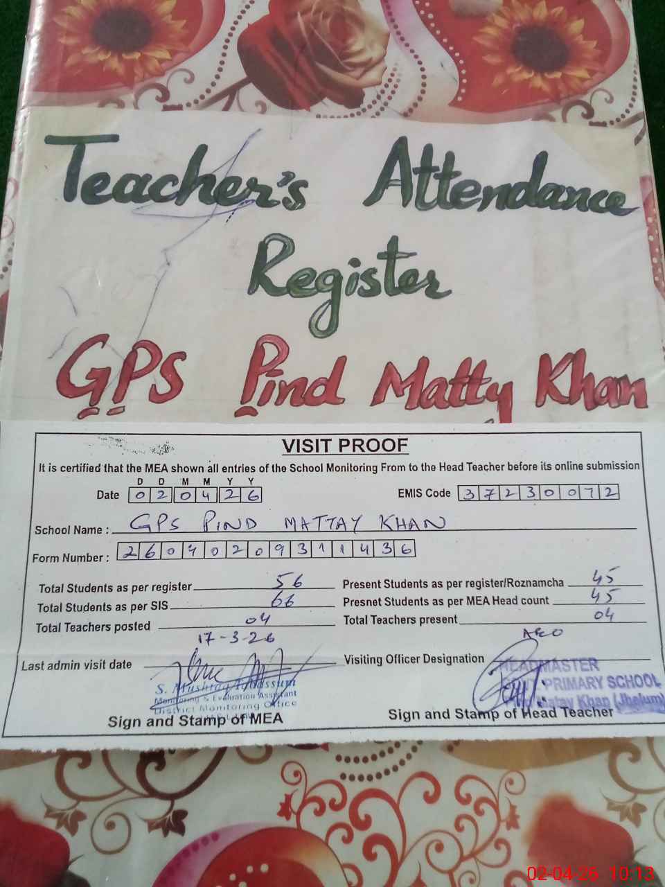 | Attendance Register | Head Teacher | MEA with School | Visit Proof |