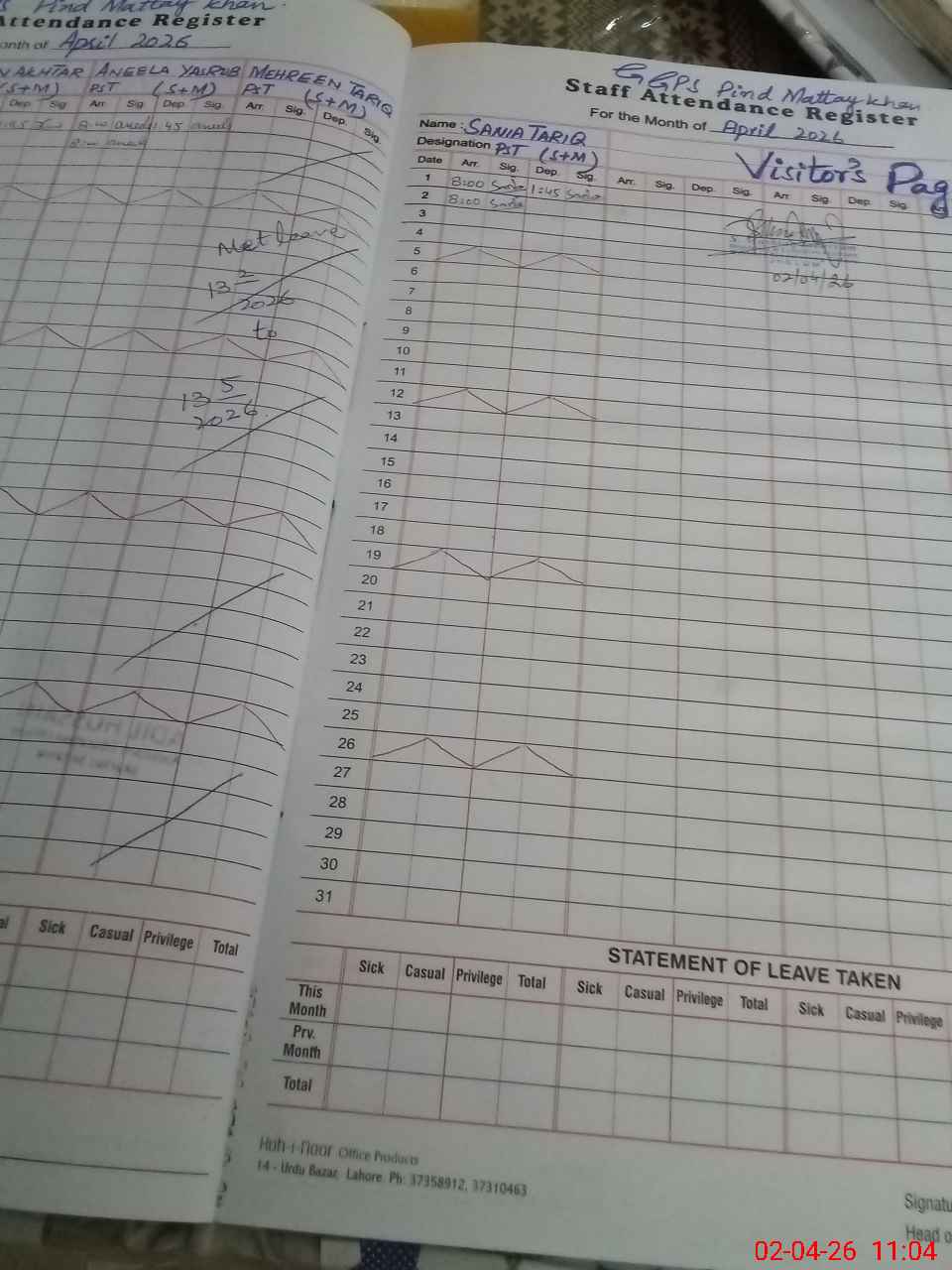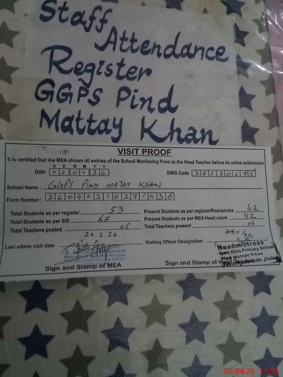 | Attendance Register | Head Teacher | MEA with School | Visit Proof |