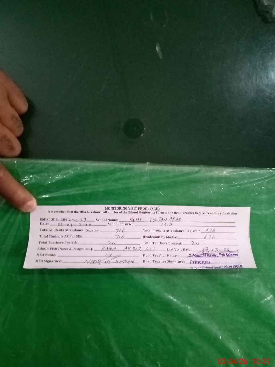 | Attendance Register | Head Teacher | MEA with School | Visit Proof |