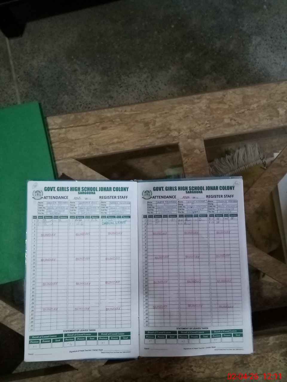 | CNIC | Full Name | Designation | R/C | Absence During Last Calender Month |