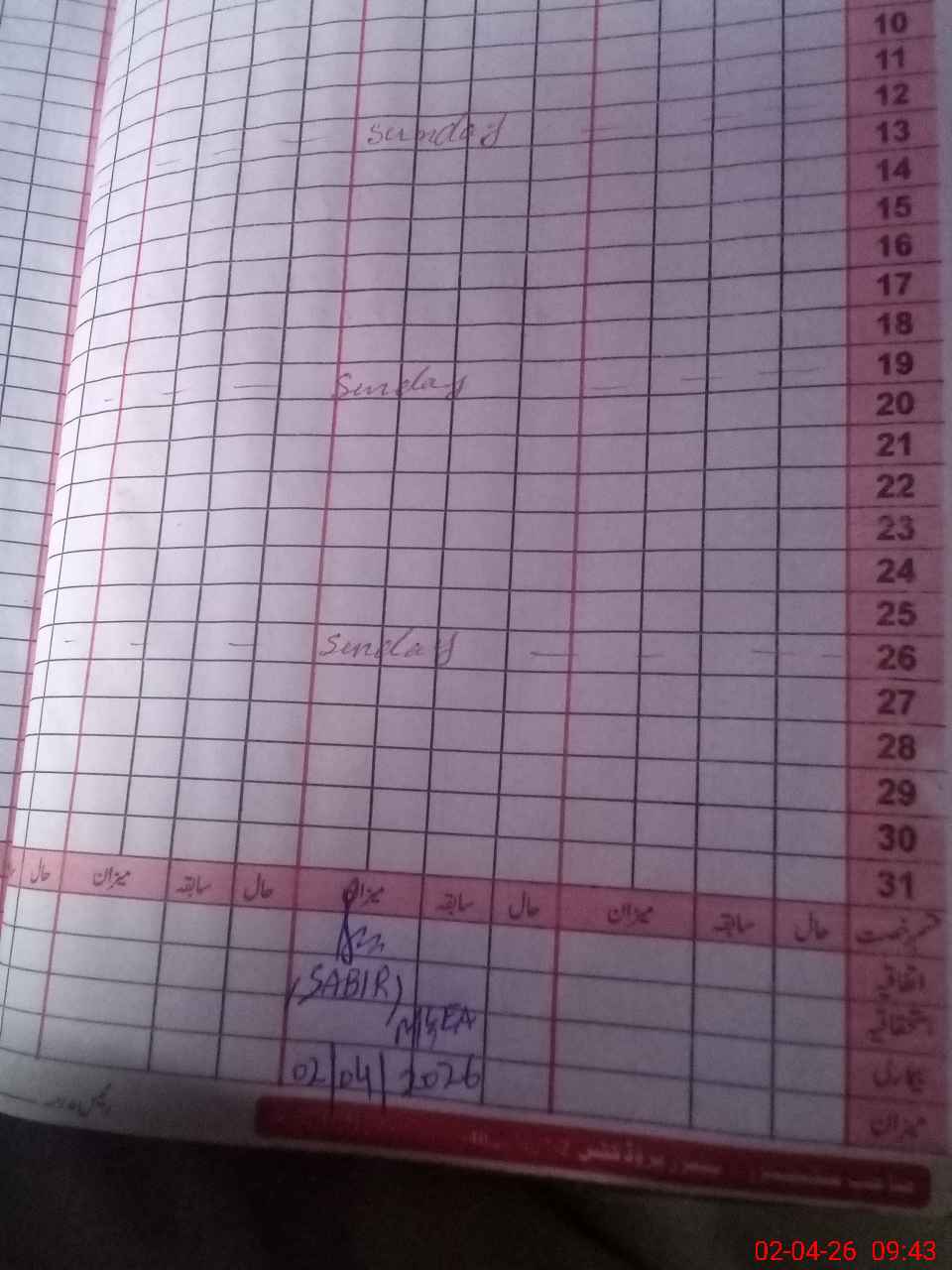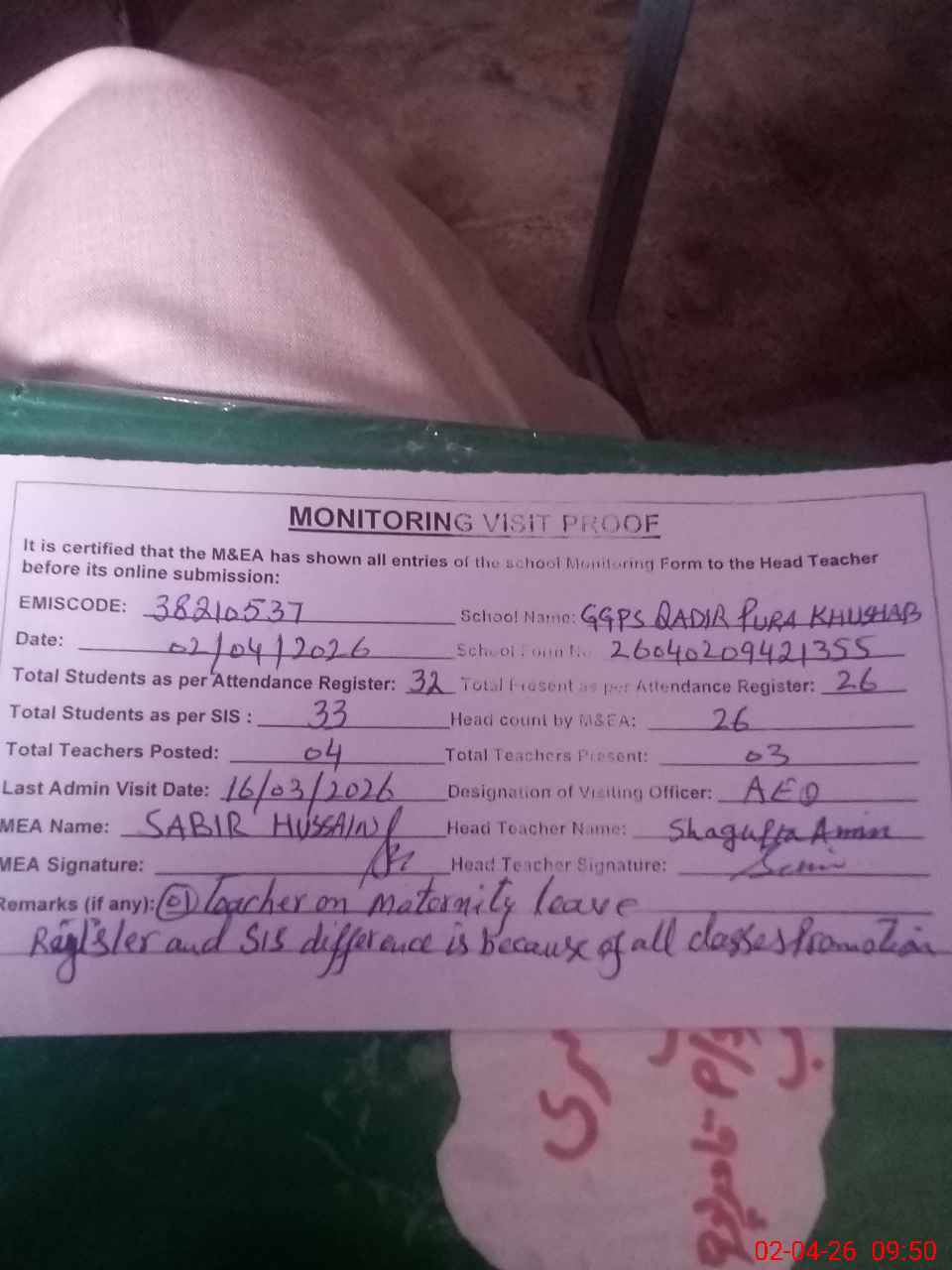 | Remarks (Use Separate Page if Required): no teacher absent total students on register 32 total students on SiS 33 difference between register and SiS is because of promotion of all classes last admin visit by AEO 26 Mar 2026 | |||||