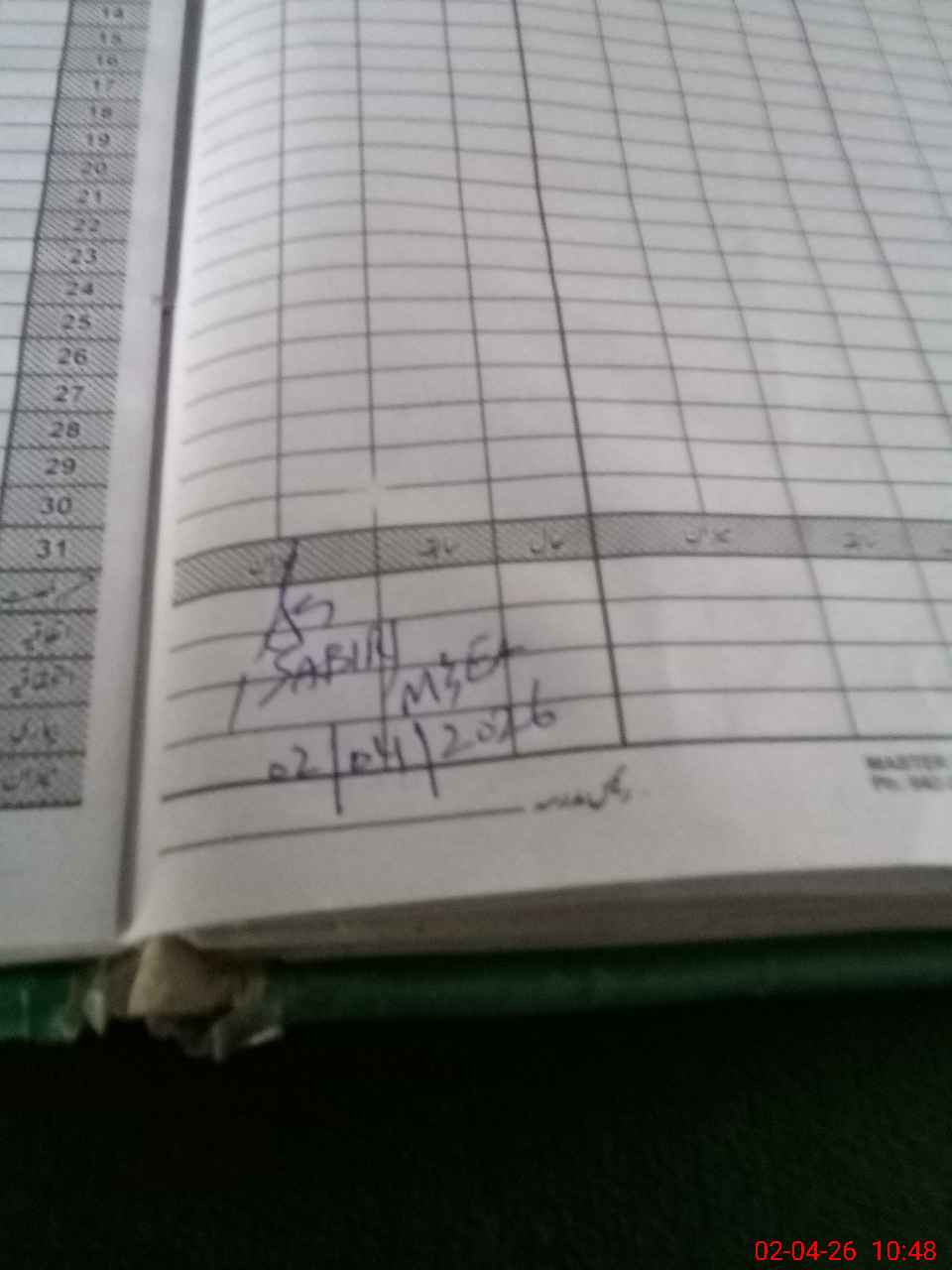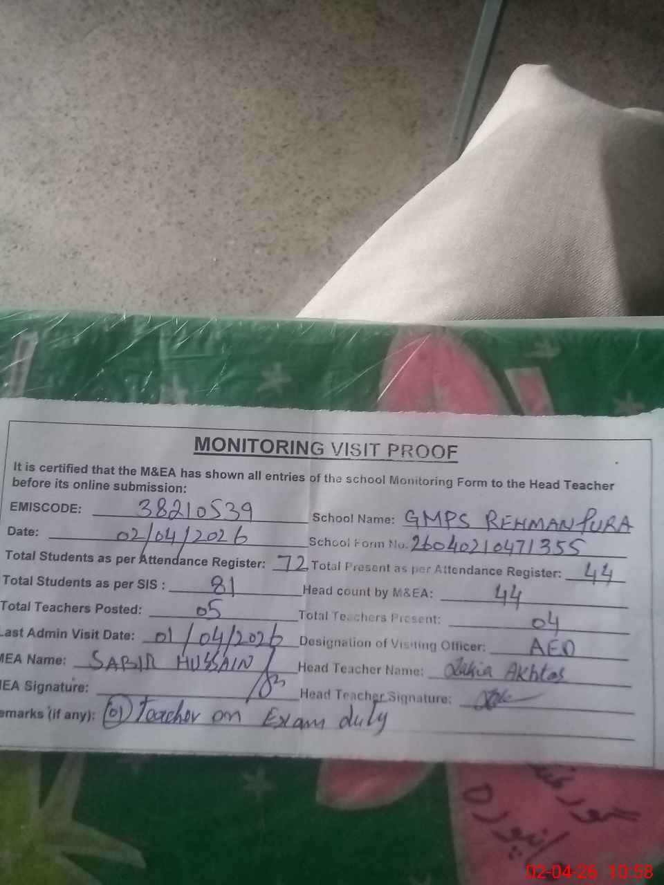 | Remarks (Use Separate Page if Required): no teacher absent total students on register 72 total students on SiS 81 Difference between register and SiS is because of promotion of classes last admin visit by AEO on 01 Apr 2026 | |||||