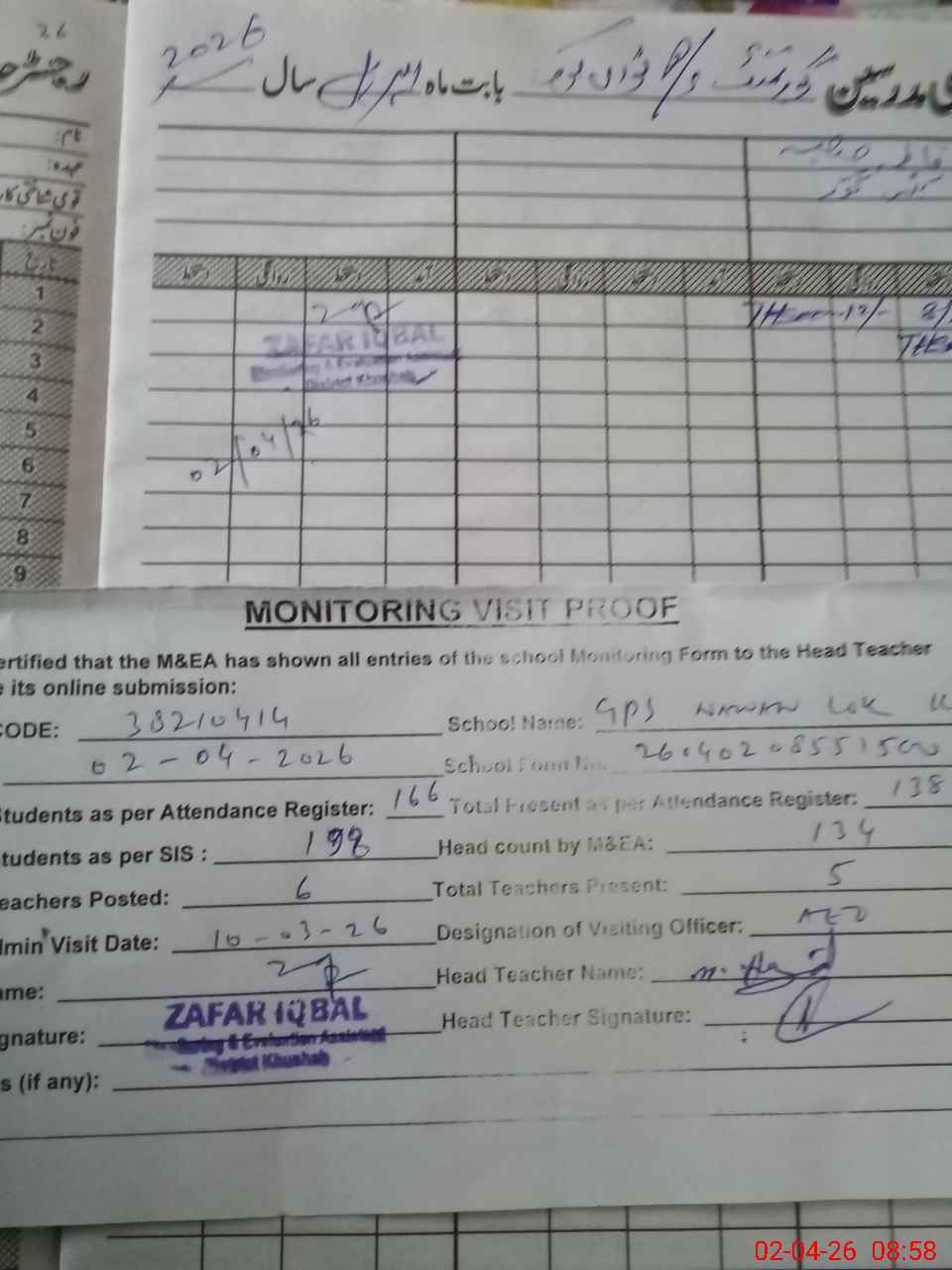 | Remarks (Use Separate Page if Required): last visit AEO 10 Mar 26 Total on register 166 Total on sis 198 | |||||