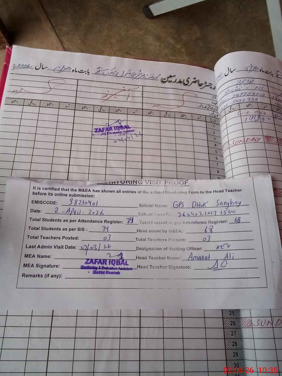 | Remarks (Use Separate Page if Required): last visit AEO 2 Mar 26 Total on register 74 Total on sis 82 | |||||