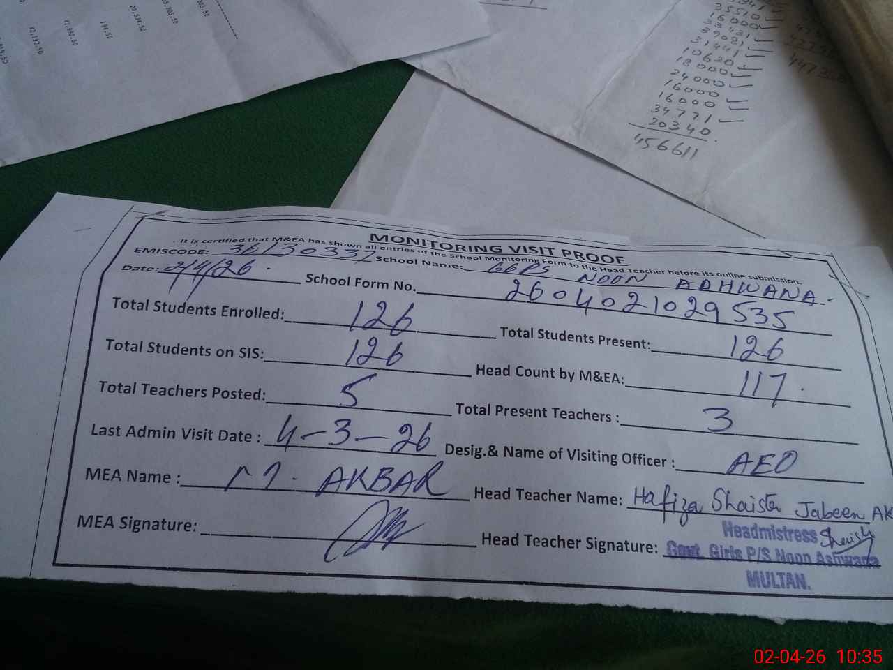 | Certified that this School was Inspected by the Undersigned MEA/DMO Today and the Information Stated Above is as Per Record. | |||||