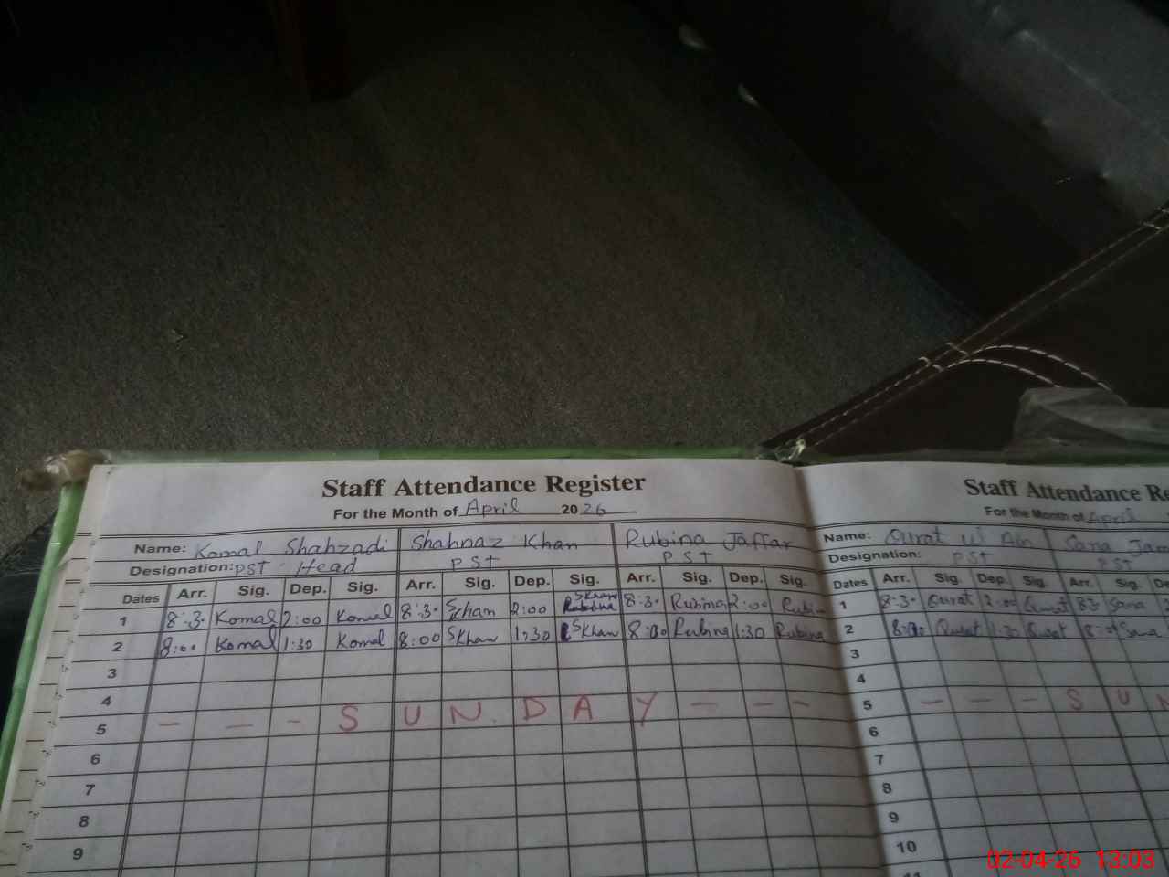 | CNIC | Full Name | Designation | R/C | Absence During Last Calender Month |