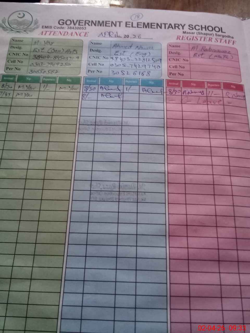 | Name: Mu**** Ra**** Na**** Designation: (School Headmaster's/Headmistress's) EST Phone/Cell Number: 03**** |